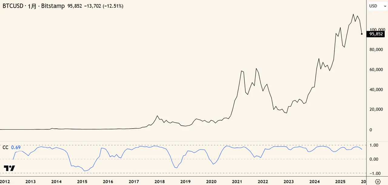 本轮周期中,比特币的独立性正在系统性消失,其价格节奏正从内部供需循环转向外部宏观力量与机构资本结构共同驱动的模式。加密资产不再依靠链上原生叙事来决定趋势,而越来越多地嵌入全球风险资产体系,成为多资产组合中的外层高波动因子,其价格路径因而呈现出与传统风险资产同步的特征。