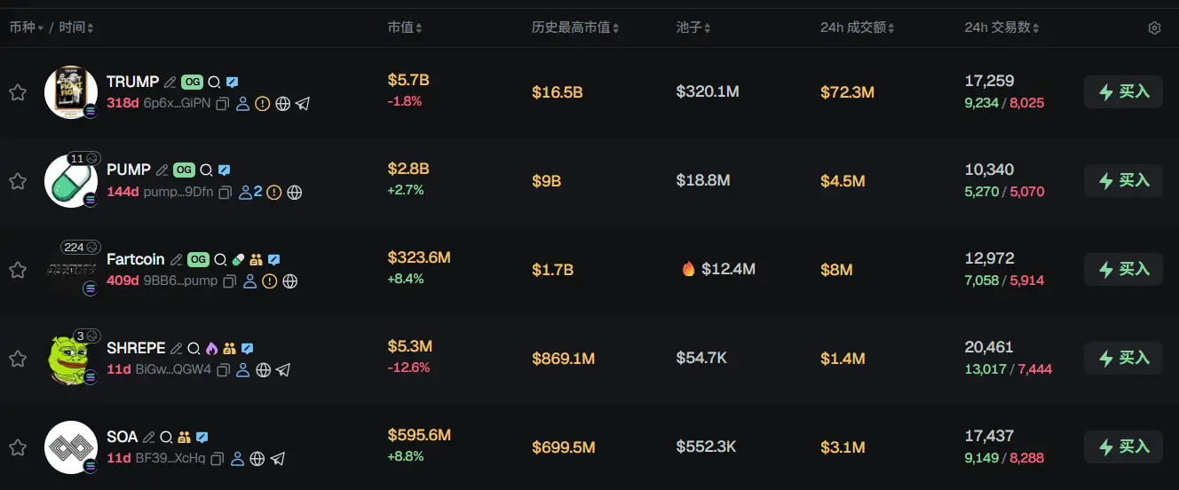 过去 24h Solana 热门代币前五依次为:TRUMP、PUMP、Fartcoin、SHREPE、SOA