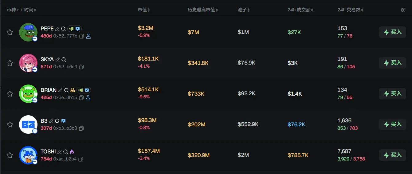 过去 24h Base 热门代币前五依次为:PEPE、SKYA、BRIAN、B3、TOSHI