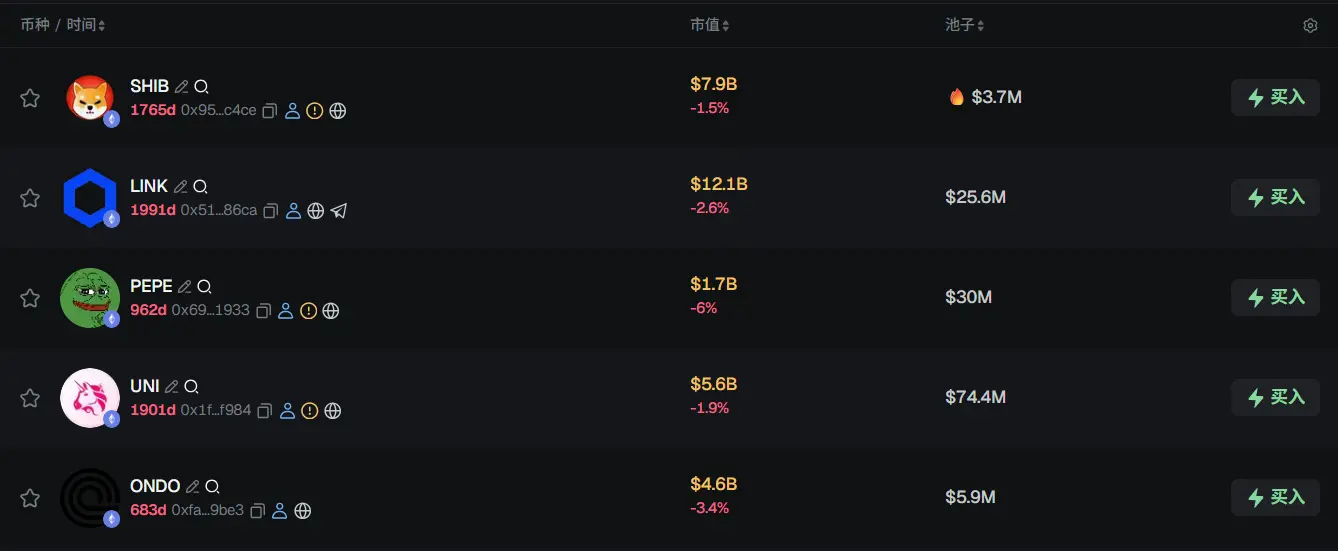 过去 24h ETH 热门代币前五依次为:SHIB、LINK、PEPE、UNI、ONDO