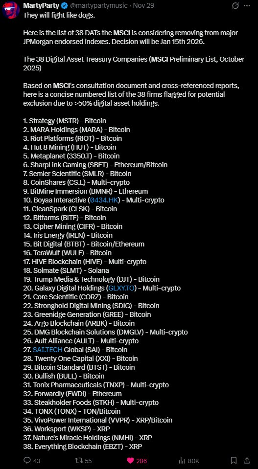 MSCI 对比特币持仓较重的公司进行惩罚——详见 @martypartymusic 的帖子: