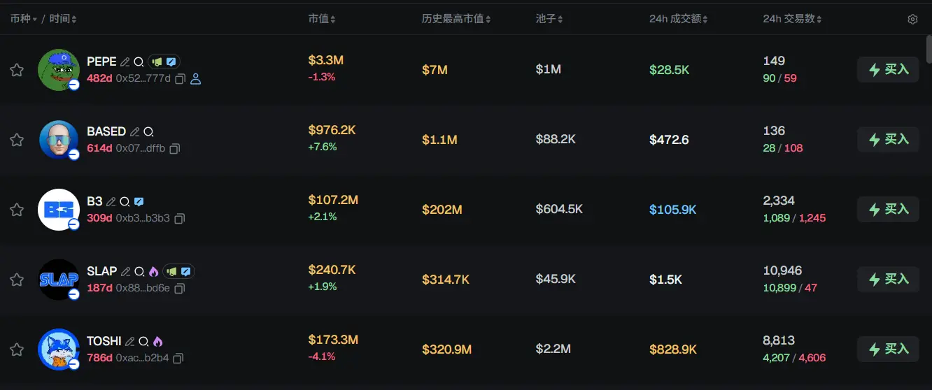 过去 24h Base 热门代币前五依次为:PEPE、BASED、B3、SLAP、TOSHI