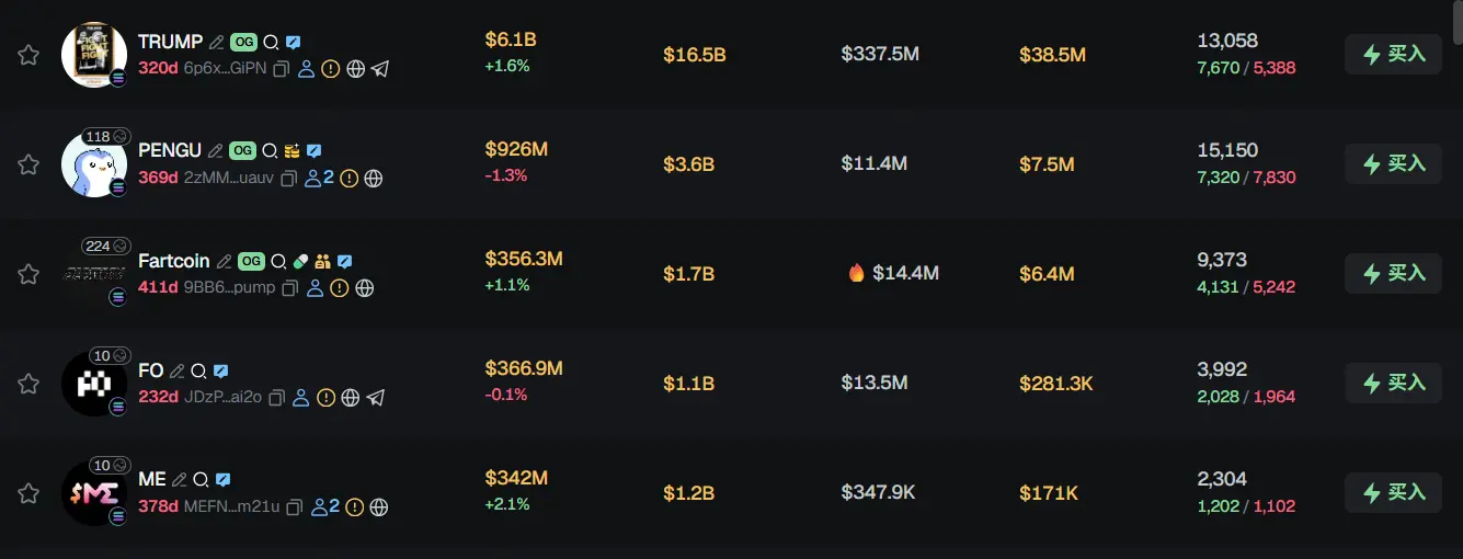 过去 24h Solana 热门代币前五依次为:TRUMP、PENGU、Fartcoin、FO、ME