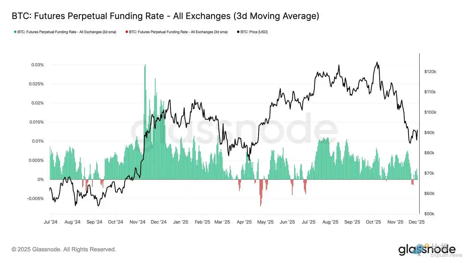 这种中性到略微负面的资金结构表明衍生品市场更加平衡,缺乏拥挤的多头头寸,减少了下行脆弱性,并可能为需求开始稳定时更具建设性的定位奠定基础。