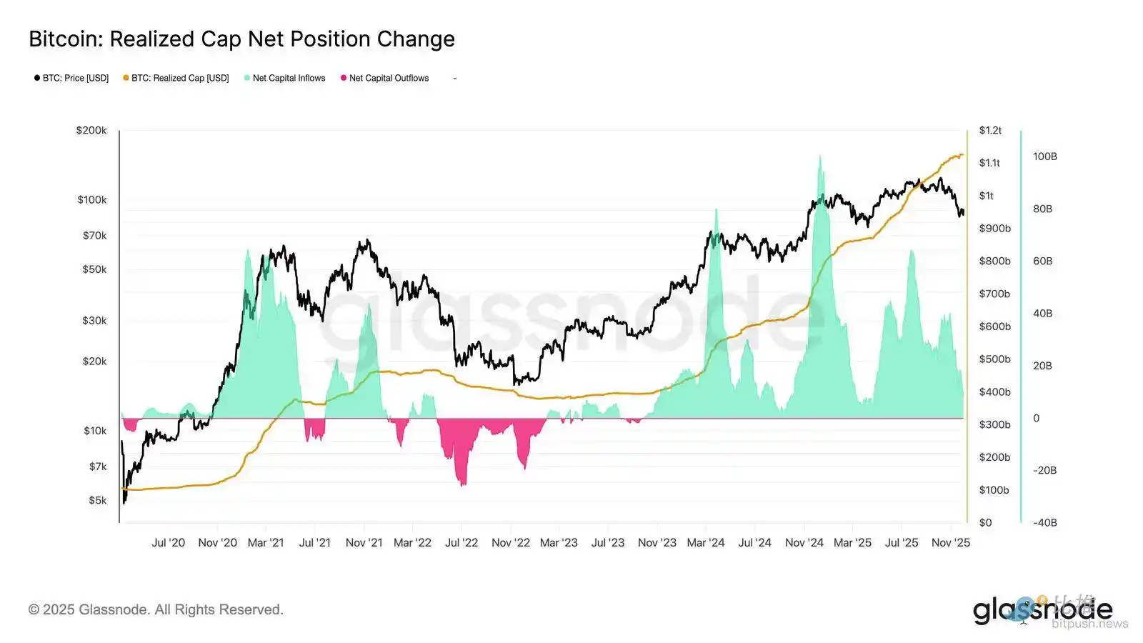 这种资本动能可以通过已实现市值净变化(Net Change in Realized Cap)来衡量,目前它处于每月 86.9 亿美元的水平——远低于 2025 年 7 月峰值的 643 亿美元 / 月,但仍是正值。