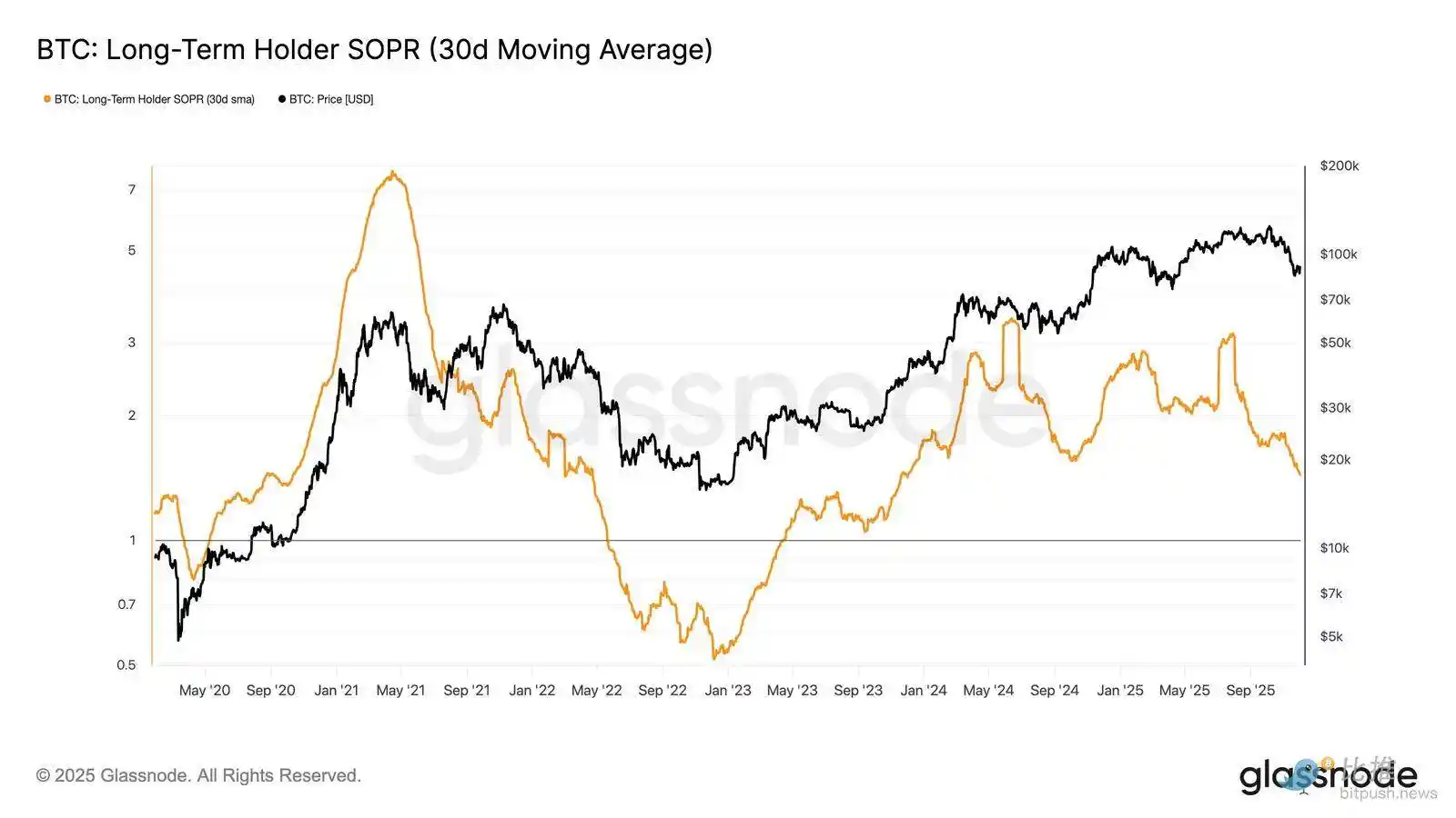 保持在正资本流入的制度中,意味着新需求仍能吸收长期投资者的获利了结。长期持有者 SOPR(30D-SMA,衡量活跃支出长期持有者的现货价格与成本基础之比)随着价格急剧下降,但仍保持在 1 以上(目前为 1.43)。这种新兴的利润率趋势再次与 2022 年第一季度的结构相呼应:长期持有者继续在盈利中卖出,但利润率正在缩小。