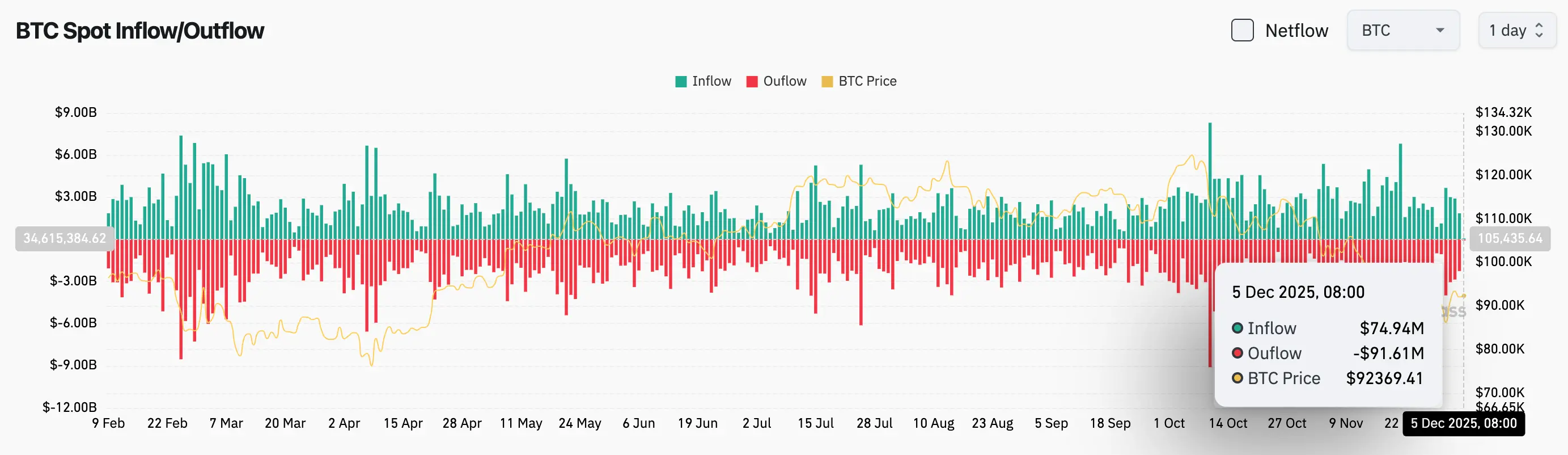 4、过去24小时内,BTC现货流入0.74亿美元,流出0.91亿美元,净流入-0.17亿美元。