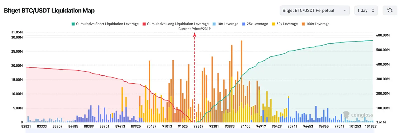 3、Bitget BTC/USDT清算地图显示:当前价位 92,319 美元附近上方累积空头爆仓量明显更大,价格一旦继续上冲,容易触发连环空头挤压(short squeeze)。下方多头杠杆爆仓带已被大幅清扫,支撑较弱,若跌破 91k 区域则可能引发多头被动抛售风险。