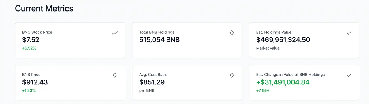 8 月 6 日,CEA Industries 正式完成了由 YZi Labs 领投的 5 亿美元定向增发。同时,它在纳斯达克交易所将股票代码从「VAPE」更换为「BNC」,并计划以「BNB Network Company」的名义运营其新的 BNB 资金战略。截至 10 月 21 日,CEA Industries 公开数据显示,其持有 50 万枚 BNB,总投资额达到 4.35 亿美元,已然是市场上资金规模最大的 BNB 财库公司。