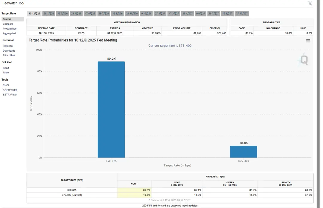 过去数周,加密货币市场在经历了强烈回调后,迎来了情绪与价格层面的显著修复。BTC 作为市场基准资产,曾一度跌至8万美元,市场在那段时间呈现出普遍恐慌,高杠杆仓位被动出清、短期风险偏好迅速下降。然而,在宏观预期变化与市场结构性反应的共同作用下,BTC 在近期快速反弹并重回94,000美元上方,24小时涨幅达到7%–8%的数据被多家机构平台报道。这样的价格行为既反映了前期跌势的缓和,也意味着市场正在从极端悲观中试图走向结构性修复。本轮反弹并非单一原因推动,而是宏观流动性、市场结构变化、技术面条件与资金行为共同作用的结果。首先,从宏观视角来看,全球货币政策预期变化成为影响风险资产的重要变量。市场对主要央行未来降息周期的预判与对流动性边际改善的预期增强,使高风险资产重新获得关注。由于11月PPI数据远低于预期,通胀压力持续缓和,以及美联储官员多次强调2026年前仍以“软着陆”为核心目标,避免过早转向紧缩。根据CME FedWatch工具最新数据,市场对12月10日美联储降息25个基点的押注概率已从一周前的35%飙升至89.2%。另一方面,美国时间12月1日,美联储宣布正式结束量化紧缩(QT)政策。同日,加密市场迎来集体大反弹。历史经验显示,无论是美股还是 BTC,均在宽松周期或宽松预期阶段表现更好,而当前市场所反映的正是这种转折性情绪。虽然宏观政策尚未明确反转,但预期本身已足以对资产价格产生推动作用。此外,在高利率政策对实体经济形成压力的背景下,市场倾向提前定价政策转向,这为风险资产提供了更多想象空间。