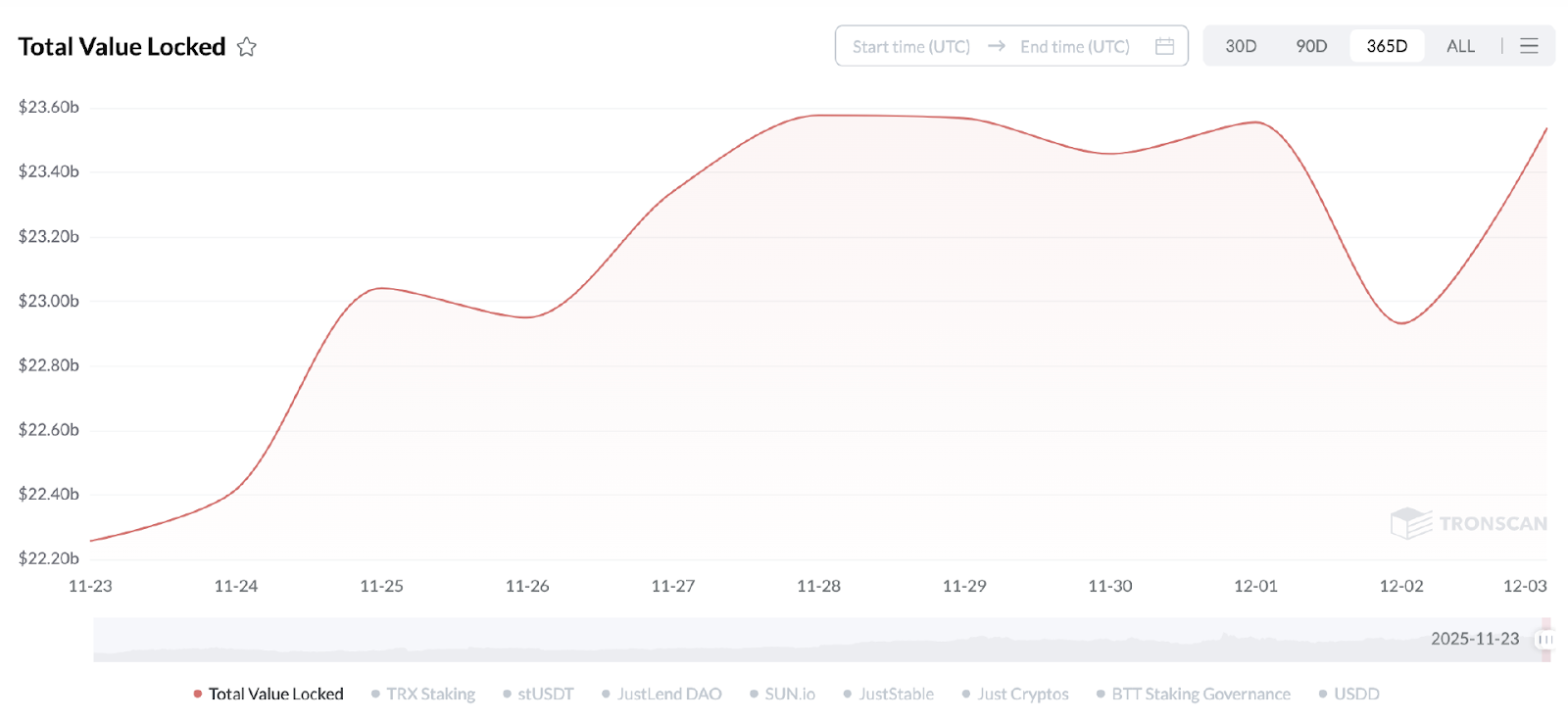 本次“五虎争霸交易赛”不仅是代币间的角逐,更成为了波场TRON生态实力的一次集中阅兵。最直观的印证来自链上数据:赛事期间,生态总锁仓价值(TVL)一路走高,峰值强势突破235亿美元。这一数字不仅彰显了生态强大的资金吸纳与留存能力,也为赛事的火热进行提供了深度的流动性支撑与市场信心,形成了“活动吸引资金,资金反哺活动”的强劲正循环。