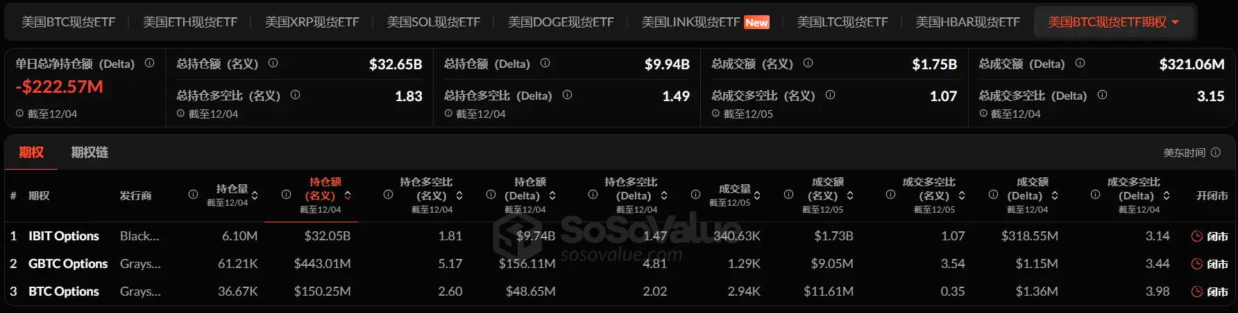 截至 12 月 4 日,美国比特币现货 ETF 期权名义总持仓额达 326.5 亿美元,名义总持仓多空比达 1.83。