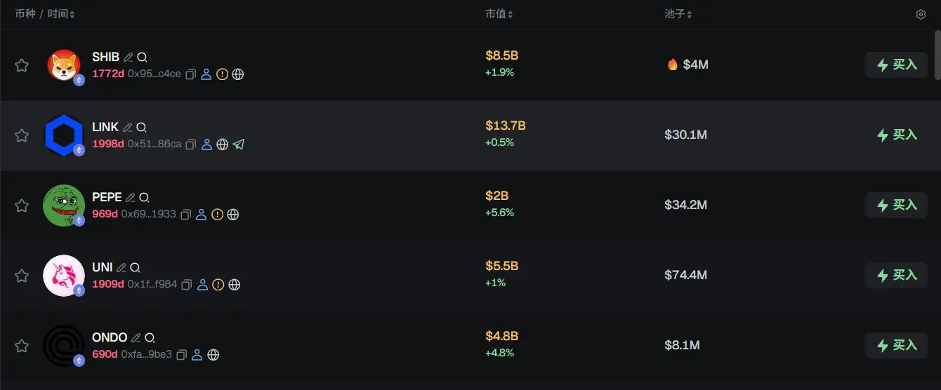 过去 24h ETH 热门代币前五依次为:SHIB、LINK、PEPE、UNI、ONDO