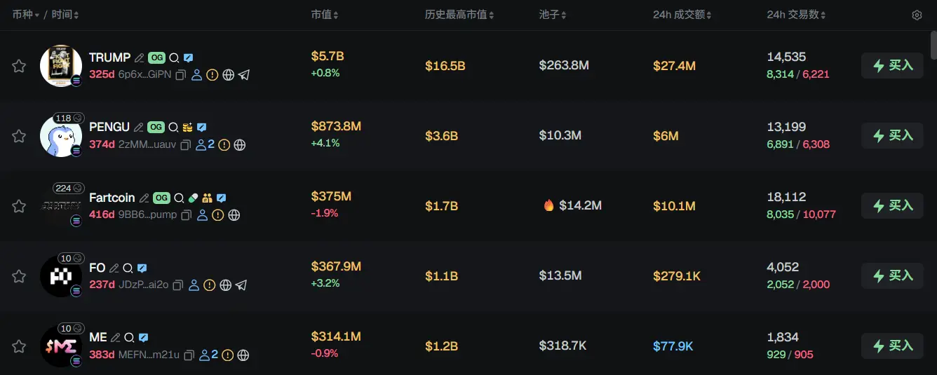 过去 24h Solana 热门代币前五依次为:TRUMP、PENGU、Fartcoin、FO、ME