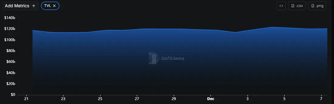 据DeFiLlama的数据,本周DeFi总TVL为1,208亿美元,较上周1,199亿美元,上升约 0.75%。