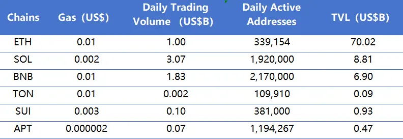 主要从日交易量、日活跃地址、交易费用分析目前主要Layer1含ETH、SOL、BNB、TON、SUI以及APT的相关数据。