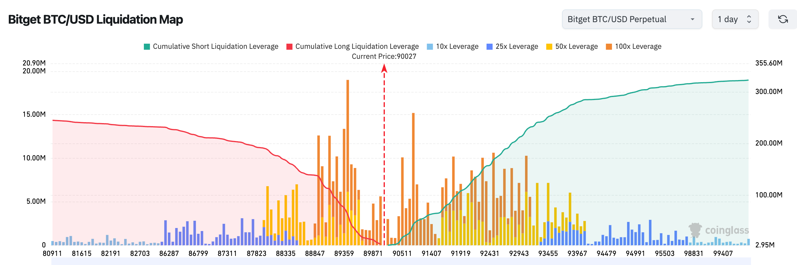 3、Bitget BTC/USDT清算地图显示:当前价格附近(约90,000 美元)上方累积了大量多头高杠杆仓位,稍有回调就可能引发多头集中爆仓。下方空头累积相对较轻,一旦价格继续上冲,空头爆仓推动的上行空间更大。