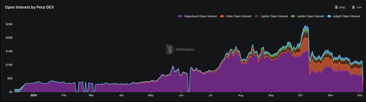 根据 DeFiLlama 的数据,PerpDex 的未平仓合约(open interest)平均增长了 3–4 倍,从 30 亿美元增长到 110 亿美元,并一度达到 230 亿美元的峰值。