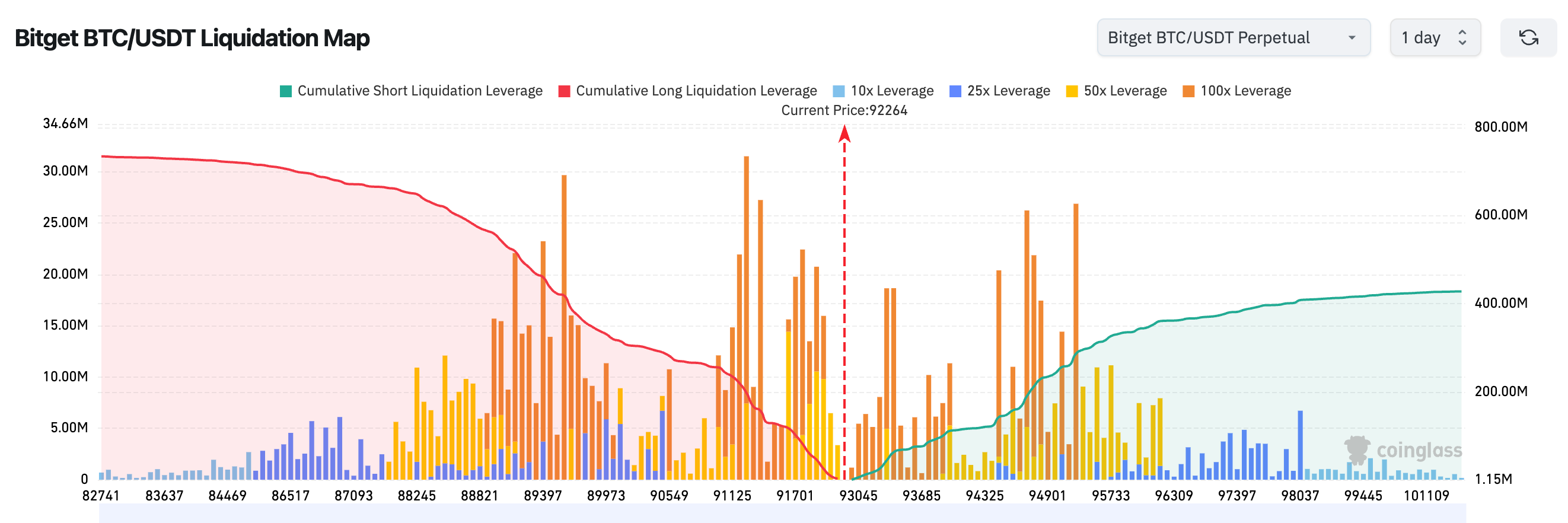 3、Bitget BTC/USDT清算地图显示:BTC 当前价附近(约 92,000–93,000 美元)是多头高密度清算区,累计多单杠杆在此区域明显下滑,显示多头风险集中。而在价格上移区间(95,000 美元以上),空头累计杠杆快速累积,说明一旦突破,空头将面临集中爆仓压力。