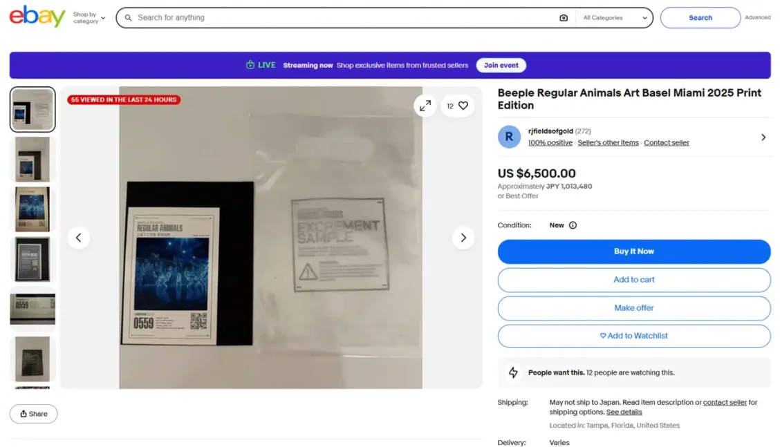 有趣的是,Regular Animas 还有实体系列,实体系列总共有 1024 幅。在 eBay 上,已经有人以 6500 美元的一口价挂售。市场给出的定价是 NFT 远比实体画作要值钱,这让人想起了多年前 Damien Hirst 的「The Currency」系列,让持有者们在实体与 NFT 间做出选择。