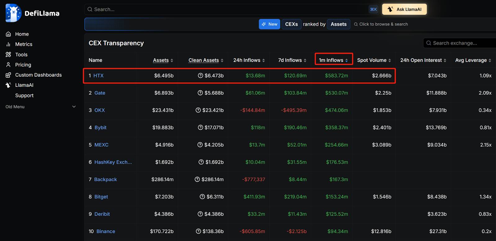 在竞争激烈、叙事不断切换的加密行业,真正不会说谎的,永远是资金流向。据12月5日Defillama 数据显示,火币HTX 过去30天净流入(1m inflows)达$583.7M,排名所有 CEX 第一。与此同时,火币HTX 保持了资产总额稳步增长、现货交易量持续走高,形成资产安全、用户增长、资金净流入的正循环。