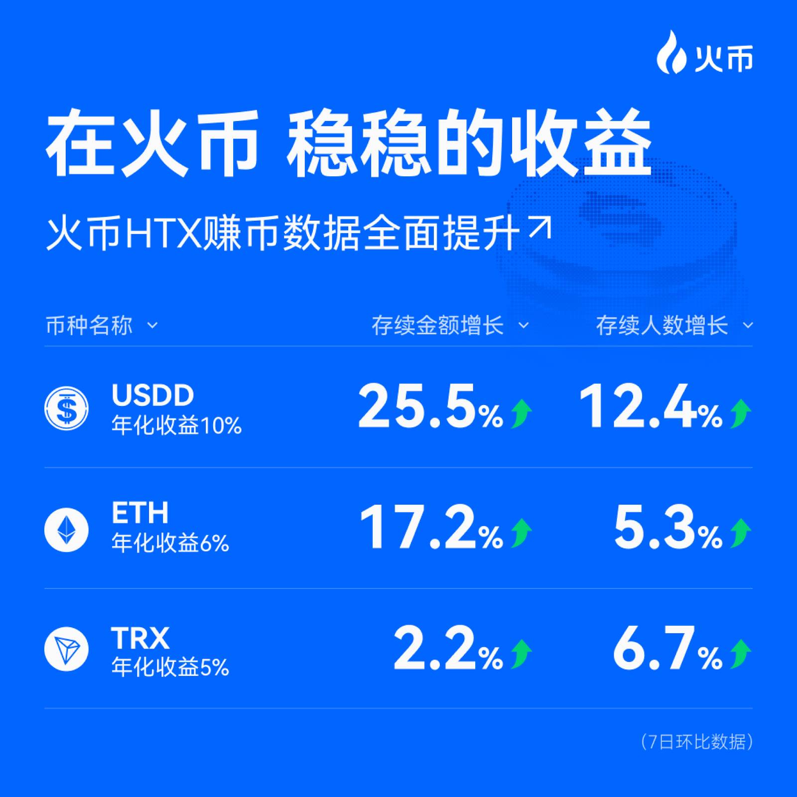 仅以火币赚币为例,过去7日数据中真实看到:存续金额和存续人数持续增长,包括USDD存续金额增长25.5%,人数增长12.4%;ETH存续金额增长17.2%;TRX 存续人数增长 6.7%。这意味着用户正在将更多资金长期托付给火币赚币的收益产品。