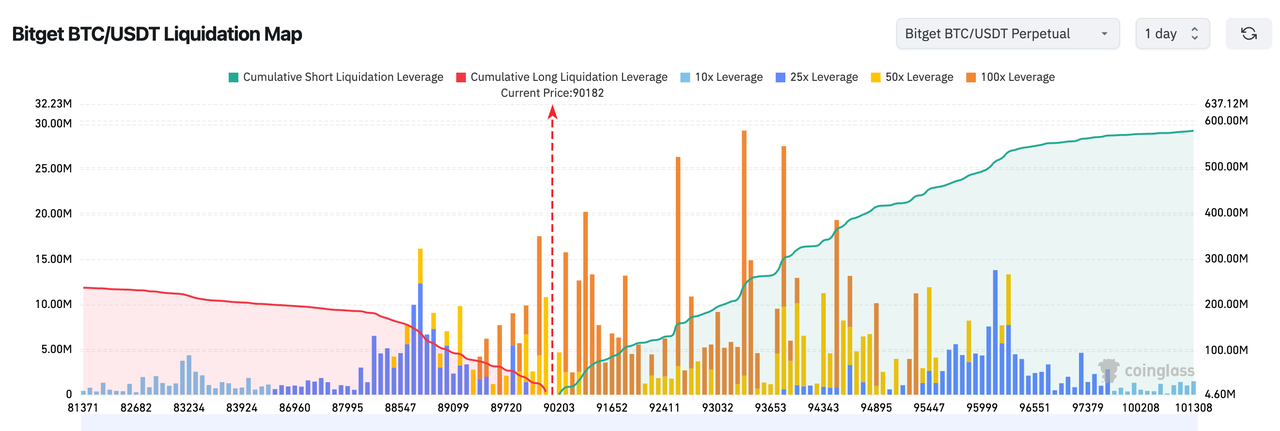 3、Bitget BTC/USDT清算地图显示:BTC 当前价格附近(约 90,182 美元)是多头高杠杆(50–100x)最密集的爆仓点区间,一旦下跌会触发明显的多头连环爆仓。而下方空头累积爆仓量远大于上方多头,意味着如果价格继续上行,空头的爆仓推升力度更强,上涨动能更足。