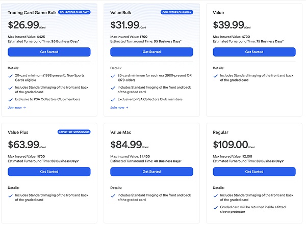 卡片的等级分为 1-10 级,10 级为完好无损,这对卡片的价值有很大影响。例如,一张未经评级的原始卡片价值 100 美元,如果送去评级并获得 PSA 10 级,则价值 2000 美元。因此,绝大多数收藏家和直播开包者都会选择将高价值的卡片送去评级。