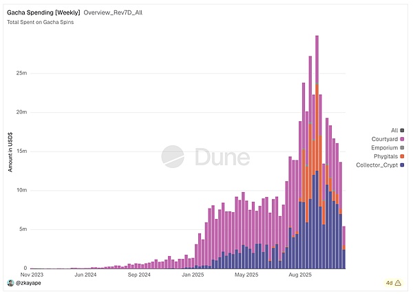 Gacha 抽卡平台(Courtyard、Collector Crypt、Phygitals):由二级市场板块构建的非官方 TCG 包。三大平台的年 GMV 已达约 7.5-8.2 亿美元,净利润率约为 10%,80/20 来自于赌徒和粉丝。