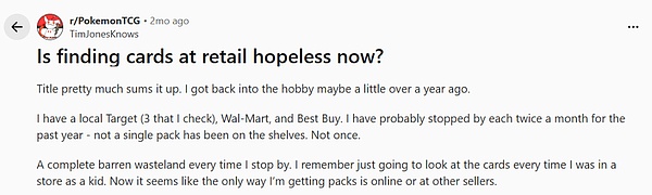 此外,区分商店类型也很重要。沃尔玛/Target 等大型商店以 MSRP 向市场销售。但也有像上述商店 A 和商店 B 这样的例子,他们是拥有分销商配额的个人品牌,以 10%-50% 的加价向市场销售。一般来说,真正的零售收藏者几乎不可能直接从 Target/Walmart 获得密封产品,他们往往不得不去找这些小商店,或者完全通过灰色渠道获得产品。