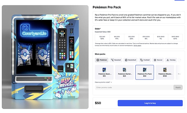 一般来说,Gacha 机是由第三方(Courtyard、Beezie 等)策划的非官方产品。Gacha 平台从二手/灰色市场上挑选卡牌,购买库存,并从中策划非官方卡包。