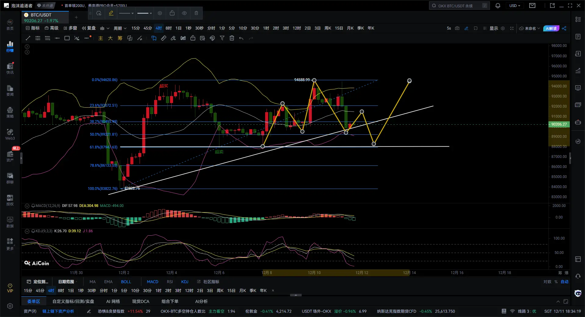 重点关注斐波那契回调线,当前比特币的价格从最高点94688回落,现在打到38.2%(90495)到50%(89200)的区间内。这个区间是主升浪正常的回调位置。关键支撑区在89200(50%)—88300(61.8%)这里是多头比较舒服的“上车价”。只要61.8%这条线不破,就是健康的回调,之后还会继续向上。