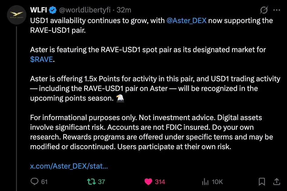 Aster 宣布将于 12 月 12 日 12:00 UTC 正式上线 RAVE/USD1 现货交易对,并推出平台史上最高的 1.5× 交易积分(Symbol Boost)加成。与此同时,WLFI(World Liberty Financial)将为 RAVE/USD1 交易者提供积分奖励扶持,象征着对 RaveDAO 生态潜力与社区基础的高度认可。