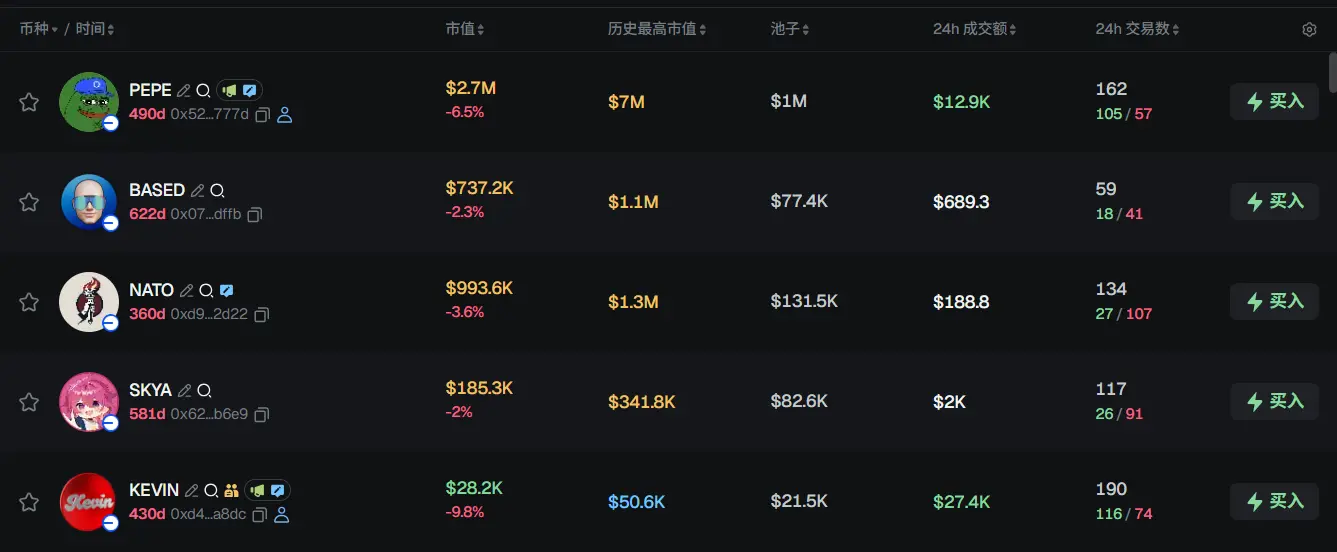 过去 24h Base 热门代币前五依次为:PEPE、BASED、NATO、SKYA、KEVIN