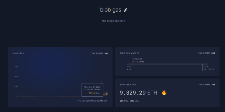 目前blob fees在12.11 23:00 1h的费用已达到Fusaka升级前的5696.3 亿倍,一日燃烧1527枚ETH,blob fees成为燃烧贡献比例最高的部分,高达98%,当ETH L2进一步活跃时,该升级有望让ETH重回通缩。