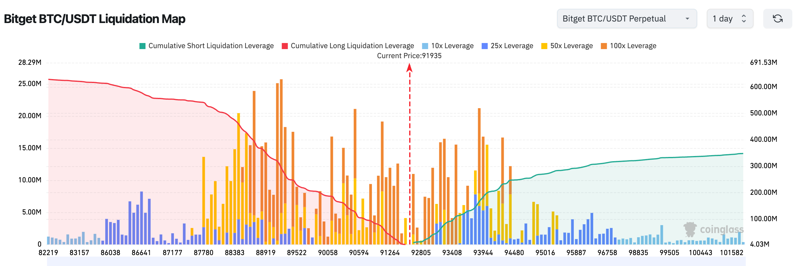 3、Bitget BTC/USDT清算地图显示:当前 BTC 价格附近(约 9.2 万美元)上方累积大量 空头杠杆仓位,一旦突破,将引发进一步的空头踩踏;下方多头累积清算区较密集,说明价格若回落到 8.8 万~9.0 万区间,将触发明显的多头清算风险。