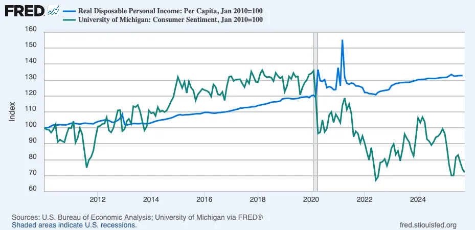 下方的图表大致展示了“氛围衰退”开始的时间点,展现了情绪与经济数据之间的分化趋势。在疫情冲击后,实际可支配收入得以恢复并继续增长,回到了正常趋势。然而,公众情绪却从未恢复。它滑入了类似经济衰退的区间(甚至更低),并一直停留在那里,即使经济基本面已经稳定下来。