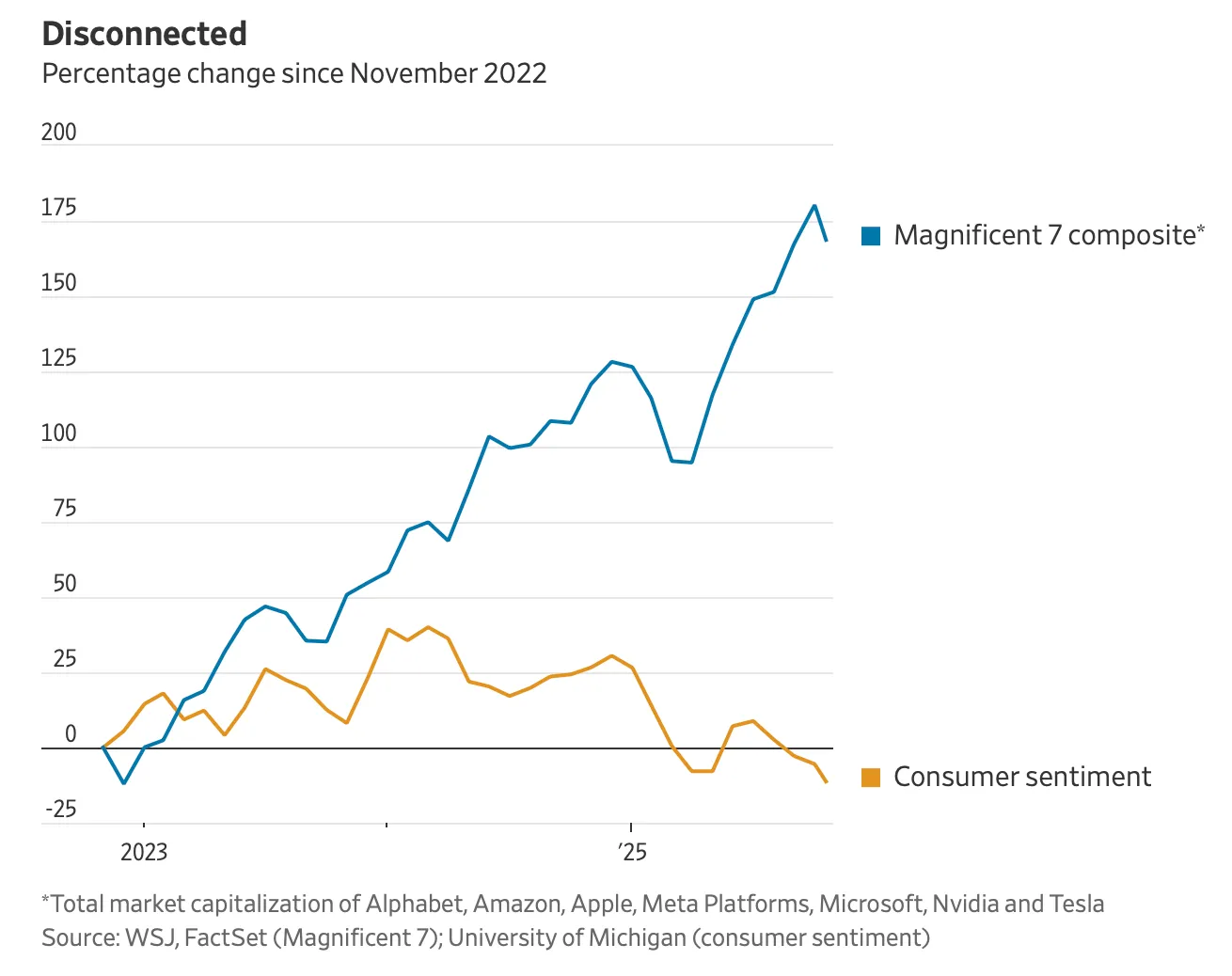 如果我们观察消费者情绪的下滑,它(粗略地说)符合经济衰退的定义——它持续时间长,影响范围广,并且情绪水平不断接近历史最低点。嘉信理财(Schwab)的凯文·戈登(Kevin Gordon)将其称为“氛围萧条”(Vibepression)——情绪极度低迷,而 GDP 则靠与人工智能相关的投资支撑起来。一个因 AI 数据中心建设而繁荣的经济,能让普通人感到快乐吗?答案显然是否定的!