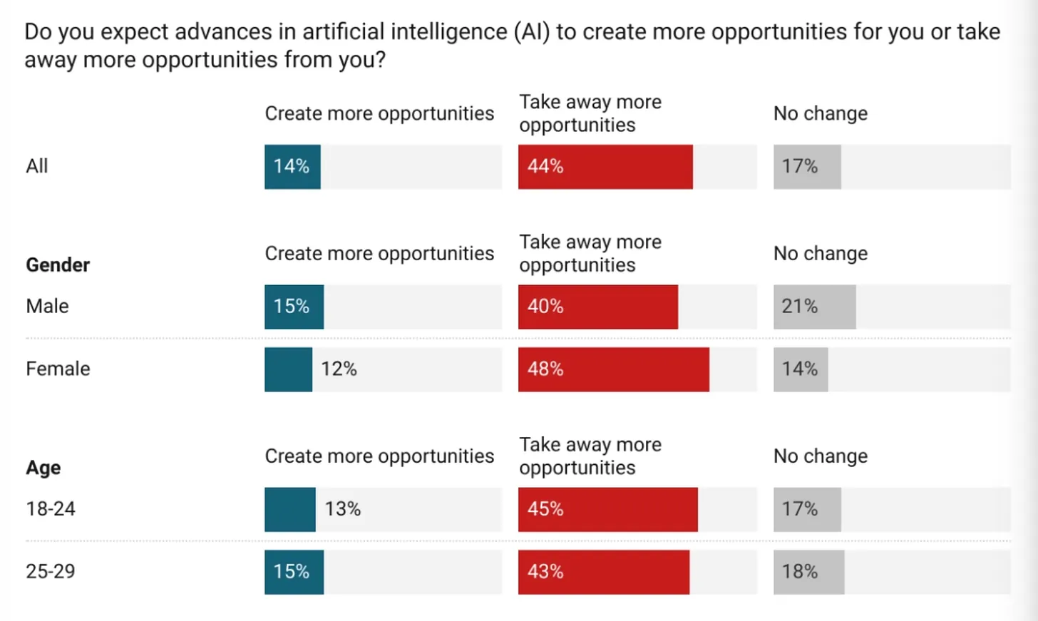 人工智能只会让这一切更加复杂。格雷格·伊普(Greg Ip)在《华尔街日报》中发表的文章《有史以来最令人沮丧的科技革命:AI让我们既富有又不快乐》(The Most Joyless Tech Revolution Ever: AI Is Making Us Rich and Unhappy)对此总结得非常到位。几乎三分之二的人对人工智能感到不安,只有 40% 的人信任人工智能行业会做正确的事情。我们拥有了所有这些技术,但我们既不信任彼此,也感到非常糟糕。