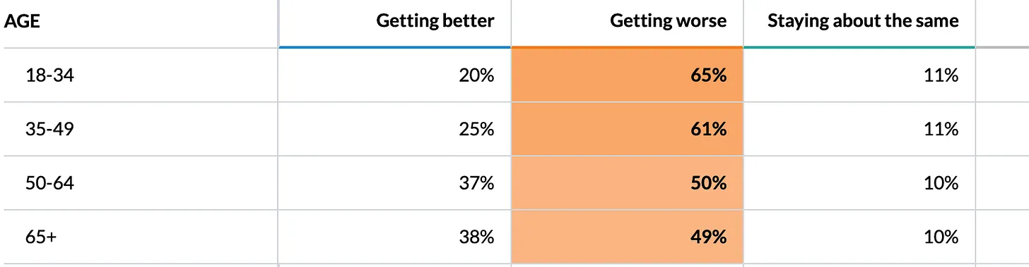 过去 70 年里,美国建立在一个简单的契约之上:提供增长,人们就会容忍其他一切。但今年我在路上走过 40 周,从不同年龄、地域和收入层的人们身上听到的最一致的反馈是,生活的基本轨迹已经不再有意义。 这虽然是一些零散的轶事,但却是人们停下来与我交谈时最常提到的内容——他们的担忧。他们不仅担心自己的财务状况,也为整个未来感到忧虑。