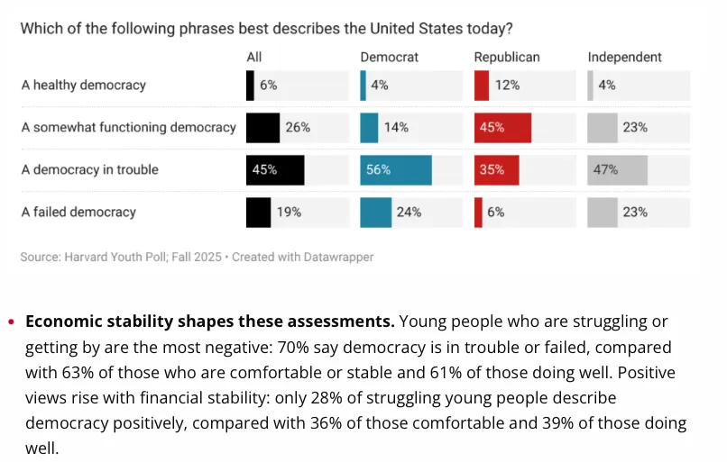 他所负责的项目——哈佛青年民意调查(Harvard Youth Poll)对2000多名年龄在18到29岁之间的美国人进行了关于信任、政治和人工智能的调查。当被问及是否认为美国是一个健康的民主国家时,受访者的回答表现出明显的党派分歧,但忧虑是显而易见的。