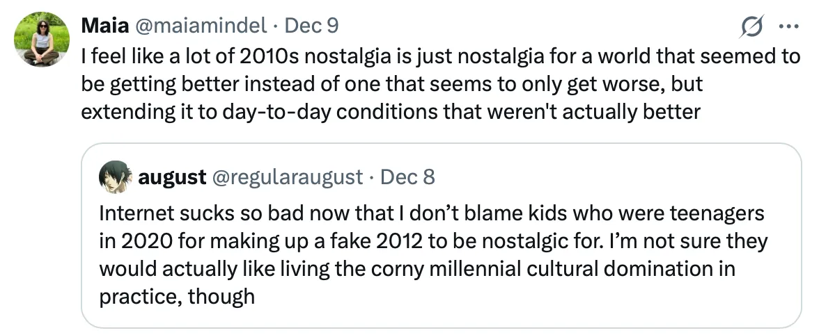 虽然2000年代和2010年代存在许多问题(真的很多!),但人们的情绪并没有彻底崩塌。如今,TikTok 上甚至出现了一种怀旧风潮(nostalgiacore),青少年们虚构了一个“2012 年”的美好幻想——他们憧憬着无限围巾、第三波精品咖啡馆,以及那个 Instagram 还只是用来分享田野里的雏菊照片的时代,而不是如今这个充满超竞争性算法厮杀的战场。