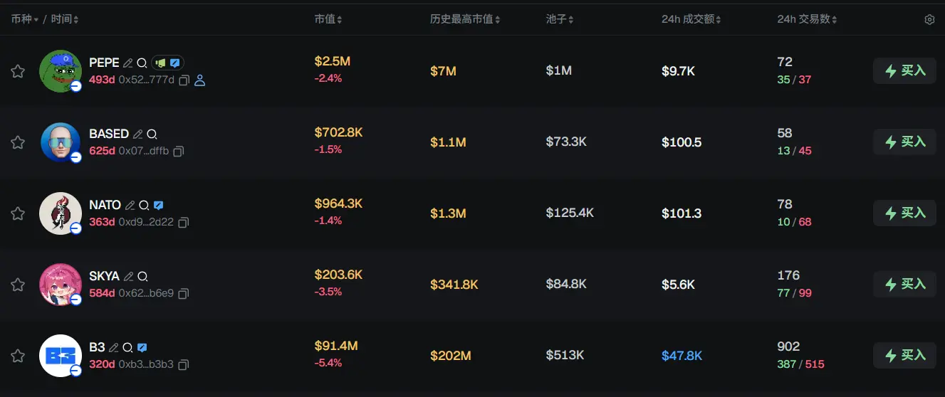过去 24h Base 热门代币前五依次为:PEPE、BASED、NATO、SKYA、B3
