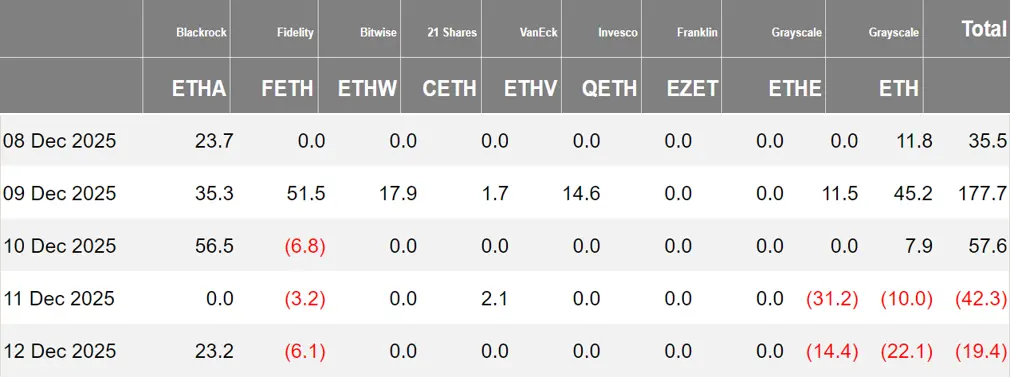 上周流入主要来自贝莱德 ETHA,净流入 1.38 亿美元。6只以太坊现货 ETF 处于净流入状态。