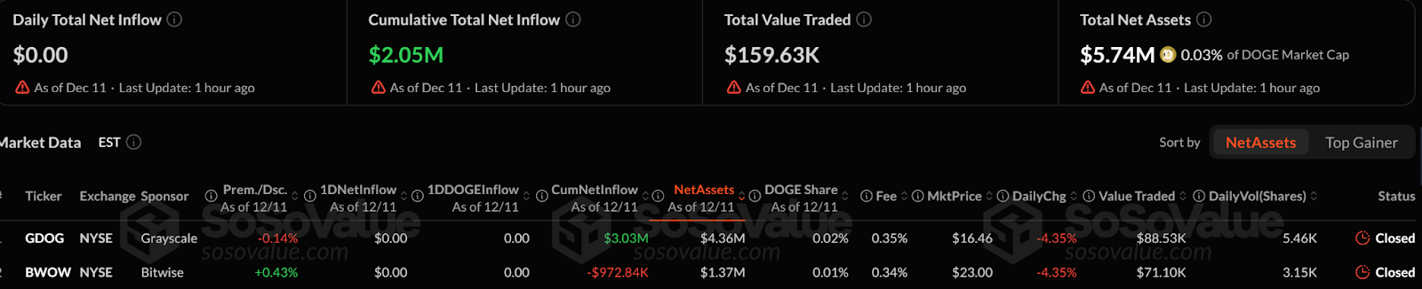 根据最新 SoSoValue 数据,截至目前 DOGE 现货 ETF 的历史累计净流入约 2.05 百万美元,这显示资金配置极为有限。交易活跃度层面,DOGE ETF 的成交额总体也较冷。尽管首日成交额曾出现几百万美元的交易,但总体成交结构并不均衡、常常伴随资金进出稀疏的情形。这样的成交表现表明 机构资金不愿意在 DOGE ETF 中深度配置。