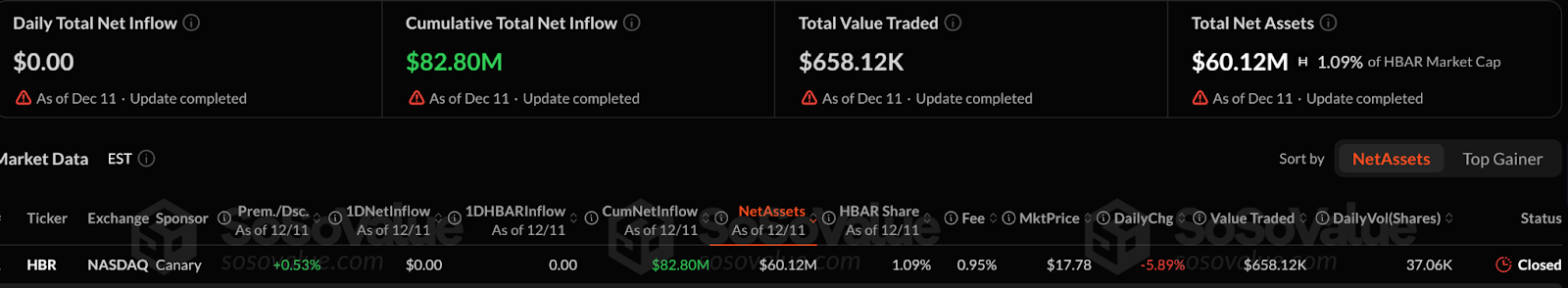 Hedera(HBAR)的 ETF 也已进入交易市场,并获得一定关注。诞生较早的 Hedera ETF 收拢了约 $82M美元左右的净资金流入,成为中等规模的山寨币产品。相比 XRP 和 SOL,HBAR 的资金量相对较少。
