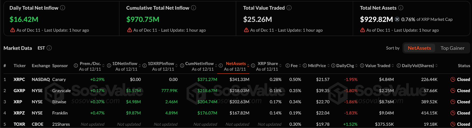 XRP ETF 在上市之后表现出较强的资金吸引力,自上市以来累计净流入约 9.7亿美元,所有 XRP 基金合计管理资产超过 9.29 亿美元,自 11 月 13 日上线以来连续多个交易日录得资金净流入,近 11 个交易日累计流入约 $756 百万美元。