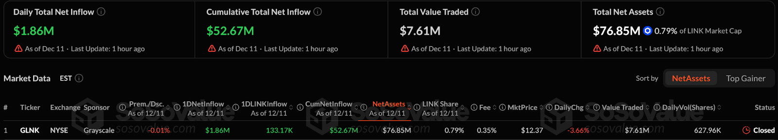 美国首只支持LINK(Chainlink)的现货ETF,灰度Chainlink信托基金(Grayscale Chainlink Trust ETF,代码GLNK)已于美东时间2024年12月2日在纽约证券交易所(NYSE)正式上市。LINK ETF 自上线以来已有约 $52M 资金净流入,AUM为$76M。资金吸引力部分来源于 Chainlink 在区块链数据基础设施领域的实际用途,使得部分长期机构投资者对其 ETF 给予了战略性配置。