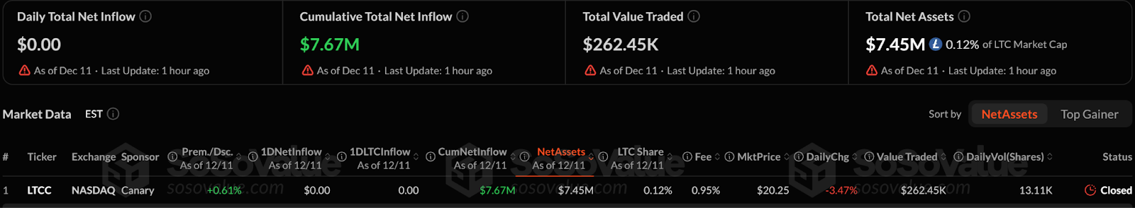 根据 SoSoValue 数据,截至 2025 年 11 月中旬,LTC ETF(通常简称为 LTCC)累计净流入资金约 7.67 百万美元。甚至有多日资金净流入为零的情况出现。相比 XRP ETF 的 数亿美元级别流入和 SOL ETF 的 数千万到上亿美元级规模,LTC 的资金吸纳明显不足,并未成为投资者构建山寨币 ETF 配置体系中的核心标的。