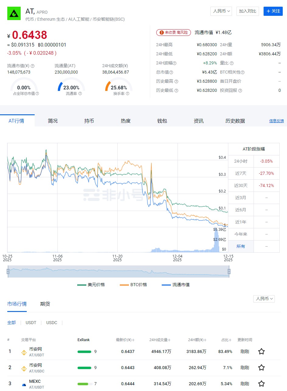 $AT 代币总供应量10亿,10月24日在Binance Alpha进行TGE,初始流通约23%(2.3亿)。